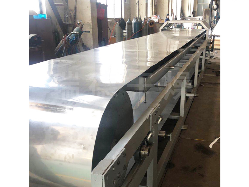 该机主要由落料模造粒成型机头,冷却输送不锈钢带及带轮、喷淋冷却系统、传动系统、保温装置、机架、刮刀等组成。落料模造粒机头主要由机头模套和机头芯轴等组成。喷淋冷却系统主要由喷头、盛水池等组成。传动系统主要由减速箱(减速器)调速电机等组成。